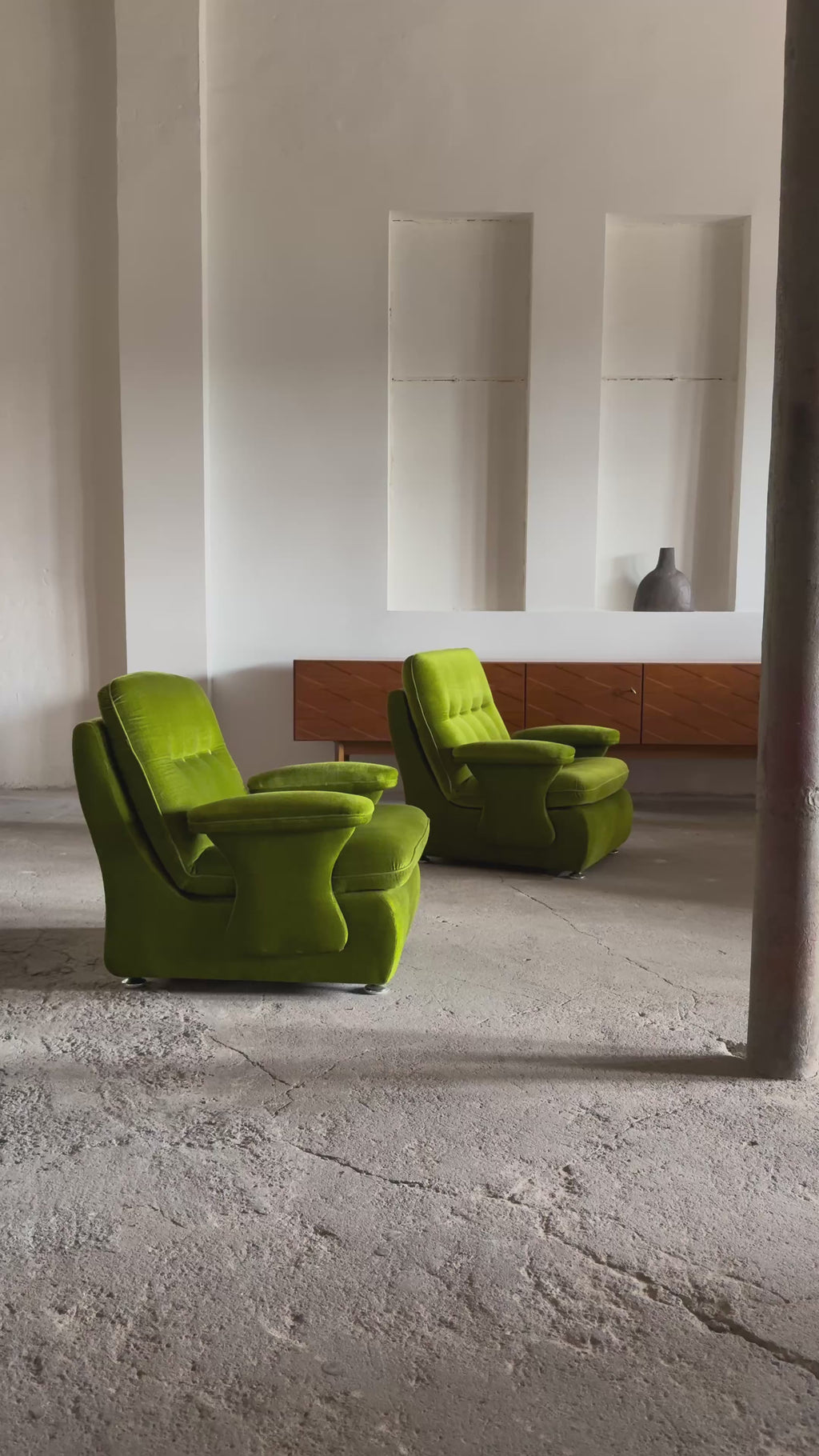 A beautiful set of two lounge chairs with chrome-plated legs in shimmering green velvet fabric and a solid wooden frame, Germany, 1970s.