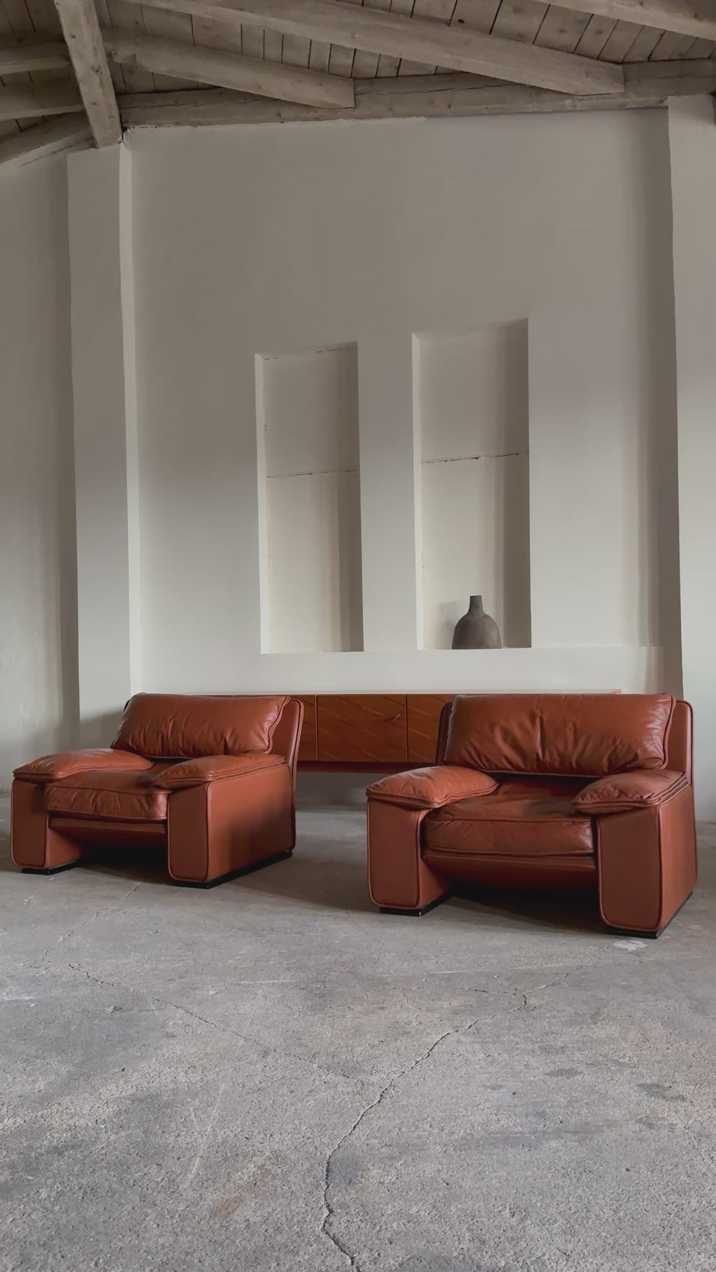 Absolutely stunning and very rare pair of T. Ammannati & G.P. Vitelli for Brunati „Thera“ armchairs in high-quality, soft, cognac-colored leather, Italy 1980s.